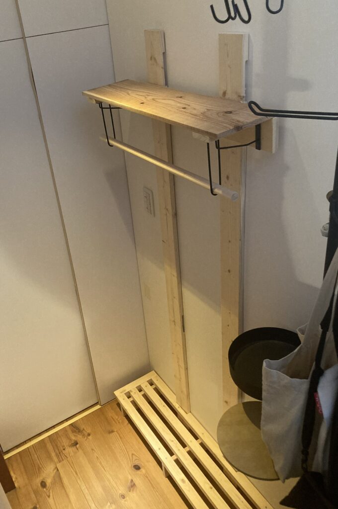 壁にピッタリとくっついた、ハンガーラックとカバン置きができました!!